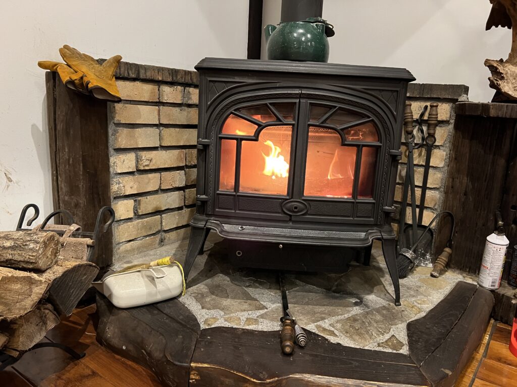 室内の奥に薪ストーブがありました。古民家や和モダンに家には薪ストーブが合いますね。